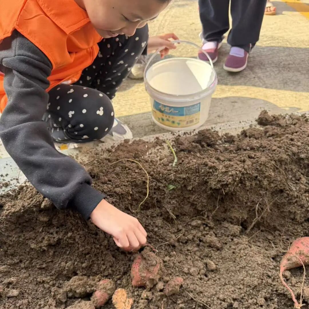 一個個大小不一、形狀各異的紅薯被孩子們親手挖了出來。雖然在勞動的過程中很累,衣服、鞋子、手上都沾滿了泥土,但孩子們臉上卻洋溢著幸福的笑容。孩子們真實地用身心體驗到收獲的快樂,體驗到有播種就有收獲,并在體驗的過程中主動發(fā)展,遇見不一樣的自己。